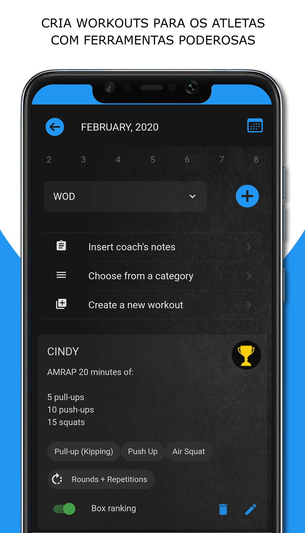 Create the workout plan with preconfigured exercises and WODS. Associate movements and videos. Score logging (individual, pairs, teams, time, reps, rounds + reps, etc.).